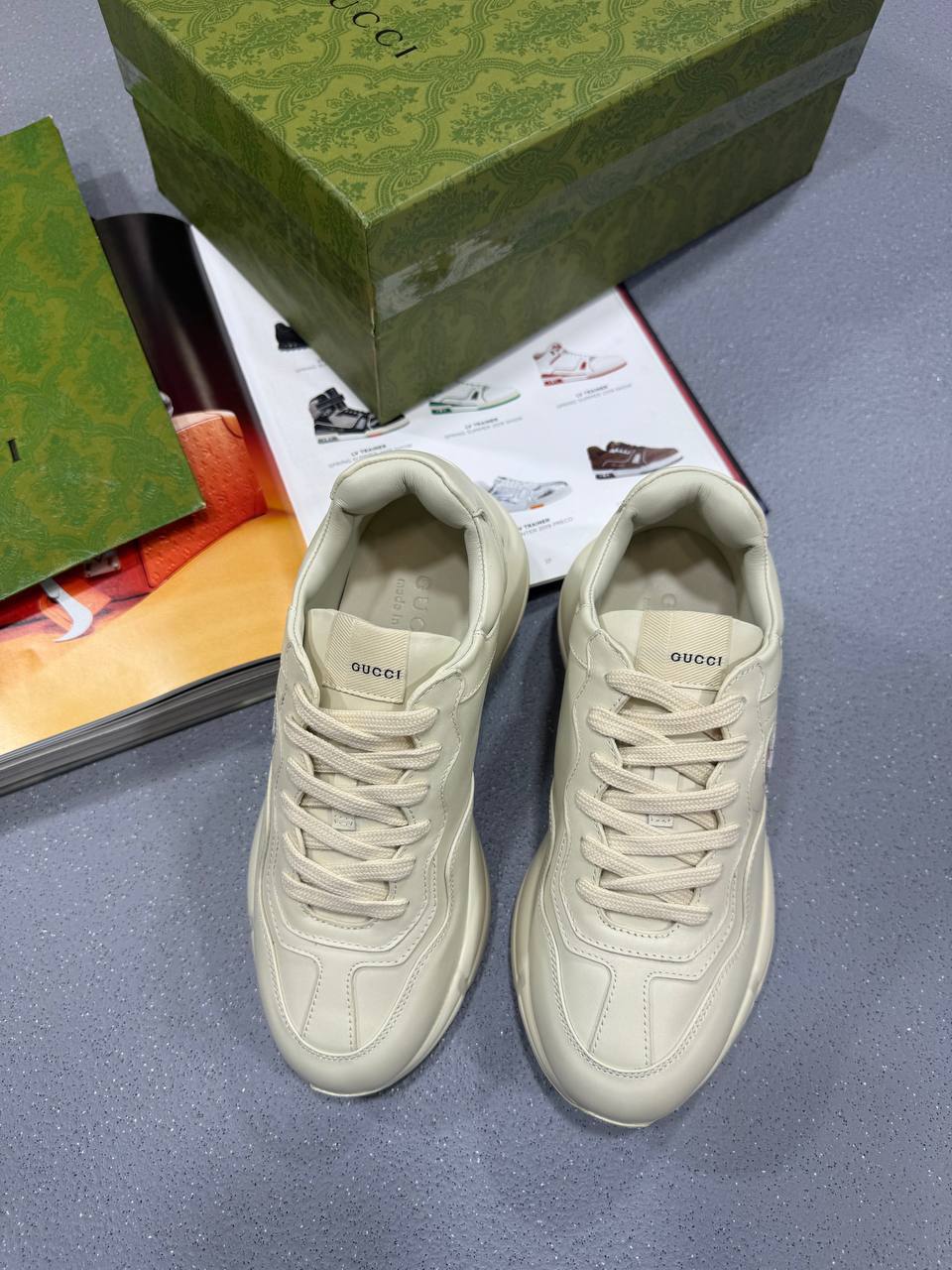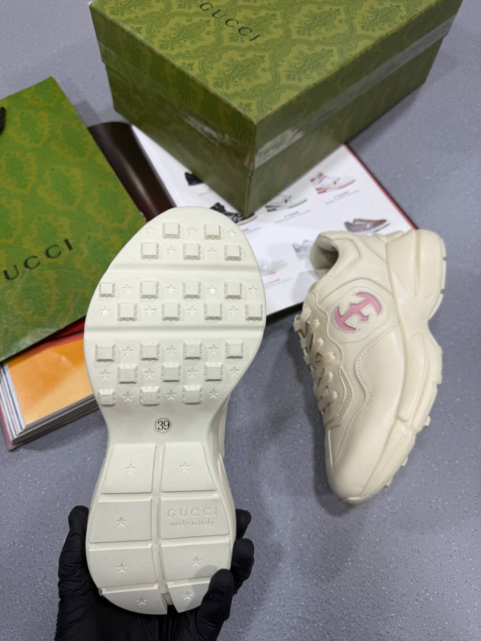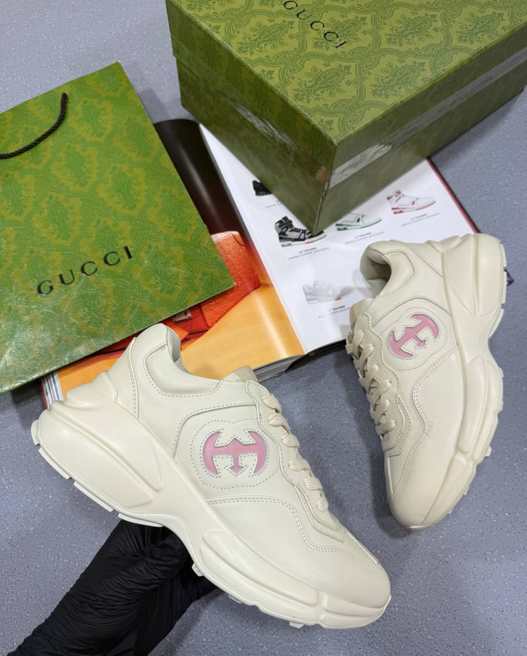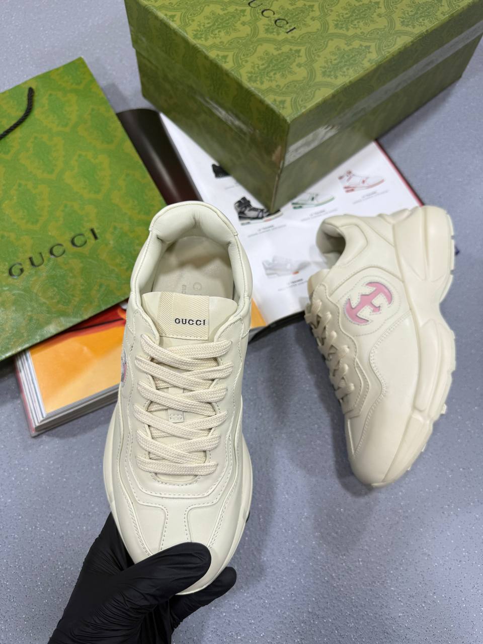 The Gucci Ladies Trainers with Pink Accent blend sporty elegance with signature luxury. Crafted from premium materials, they feature soft pink detailing, the iconic Gucci branding, and a comfortable cushioned sole — offering a stylish, feminine touch to any casual look.